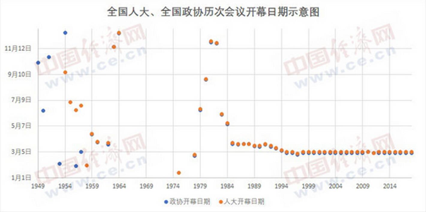 全国人大、全国政协历次会议开幕日期示意图(注:1949年统计的是全国政协一届一次会议,不含此前举行的中国人民政治协商会议第一届全体会议)