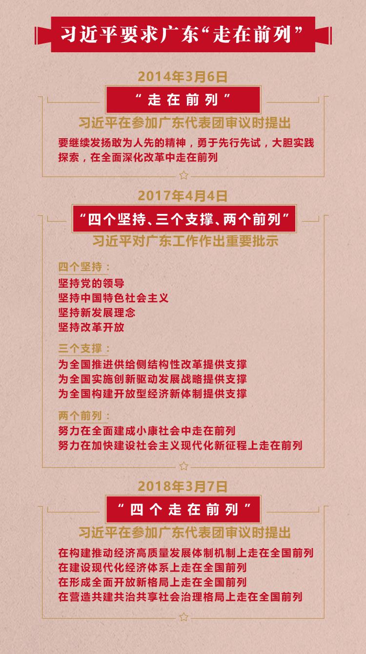 2014年3月6日,习近平又在广东代表团表示,“30多年来,广东在改革开放中很好发挥了窗口作用、试验作用、排头兵作用”。他要求广东继续发扬敢为人先的精神,勇于先行先试,大胆实践探索,在全面深化改革中走在前列。