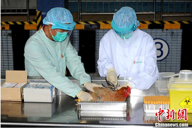 资料图:穿上整套保护装备的食安人员为活鸡抽取血液样本。中新社发 谭达明 摄