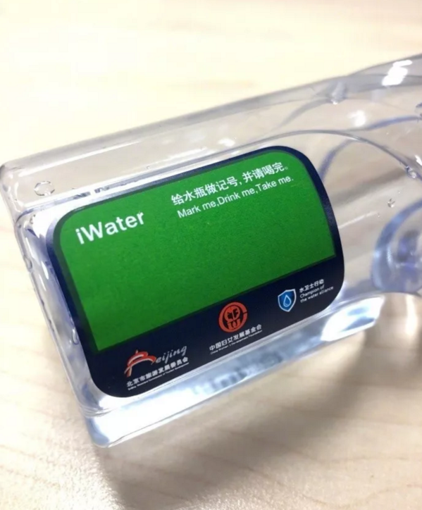 在矿泉水瓶上,一款环保标签被贴在上面。在这个绿色标签上,印有中英文的“给水瓶做记号,并请喝完”,喝不完的鼓励带走。