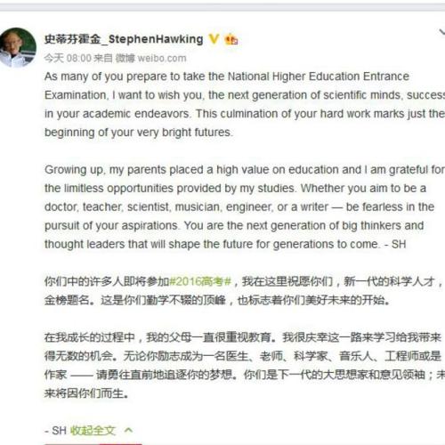 当年6月6日,高考前一天,史蒂芬·霍金的新浪官方微博帐号用中文和英文发布祝福说:“你们中的许多人即将参加2016高考,我在这里祝愿你们,新一代的科学人才,金榜题名。这是你们勤学不辍的顶峰,也标志着你们美好未来的开始”。