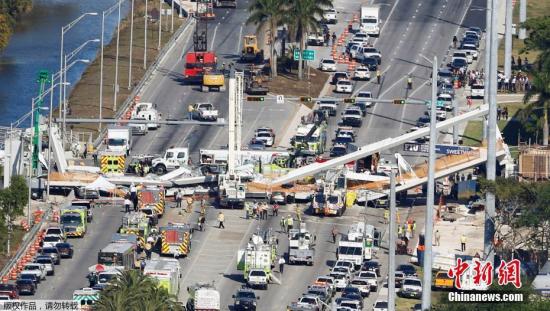 报道称,出事的天桥横跨南佛州交通最繁忙的道路之一Tamiami Trail,连接佛罗里达国际大学校园和迈阿密郊区。当天下午2点,这座正在施工的的行人天桥突然发生坍塌,汽车和行人被困桥下。