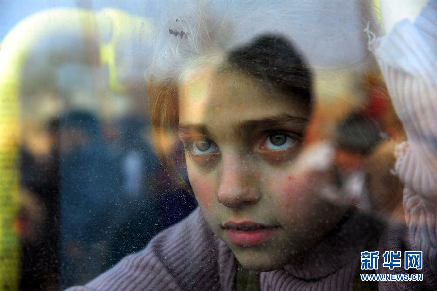 3月15日,在叙利亚大马士革东郊,一名女孩乘车前往政府军控制区安置点。