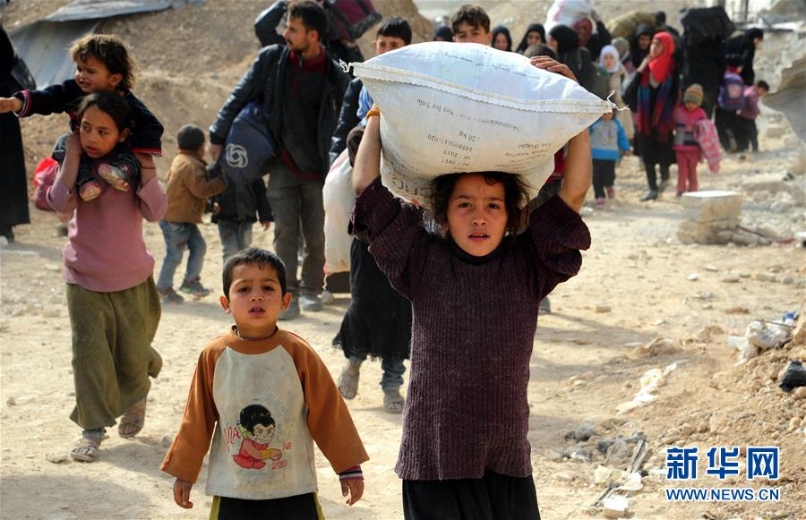 3月15日,在叙利亚大马士革东郊,被困平民从东古塔地区撤离。新华社发(阿马尔 摄)