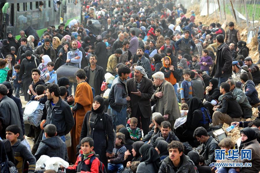 3月15日,在叙利亚大马士革东郊,撤离人员等待乘车前往政府军控制区安置点。新华社发(阿马尔 摄)