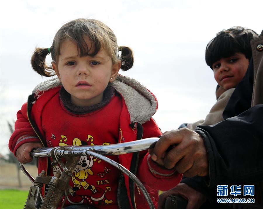 3月15日,在叙利亚大马士革东郊,一名女孩坐在自行车上随家人撤离。新华社发(阿马尔 摄)