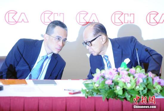 3月16日,长和系主席、香港富商李嘉诚(右)在长和全年业绩记者会上宣布退休,集团主席一职将由其长子李泽钜(左)接任。中新社记者 谭达明 摄