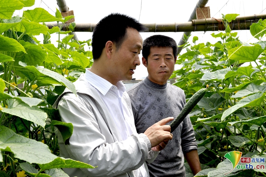裴春亮(左)在了解蔬菜生产情况。本人供图