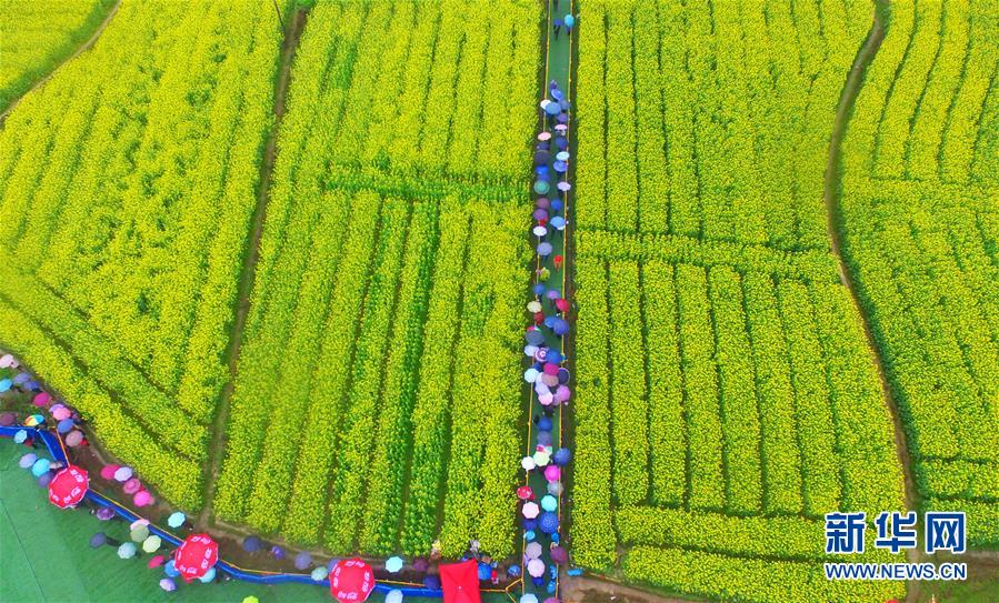 3月17日,游客在湖南省衡阳县库宗桥镇华山村欣赏油菜花。新华社发(曹正平摄)