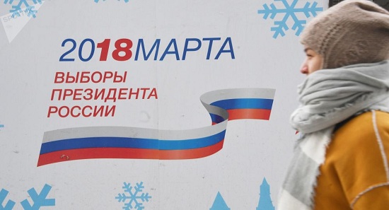 图中的背景为俄罗斯2018年总统选举宣传海报。图片来源:俄罗斯卫星网