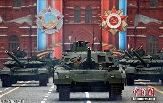 资料图:2017年5月9日,俄罗斯在首都莫斯科举行盛大阅兵式庆祝卫国战争胜利72周年。图为俄罗斯T-14(阿玛塔)主战坦克接受检阅。