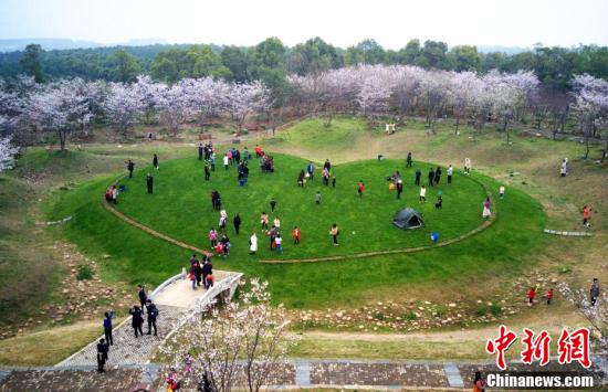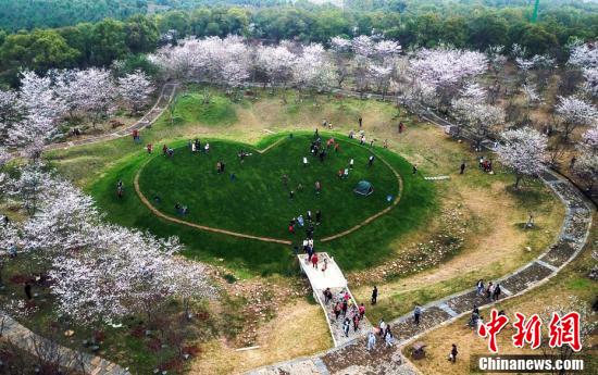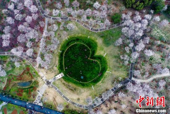 3月17日,游客在江西南昌凤凰沟景区游玩。连日来,江西南昌凤凰沟万株樱花盛放,形成延绵万米的樱花隧道,场面极为壮观,前来赏花的游人络绎不绝。图为“心形”草坪与樱花交相辉映,画面十分唯美。