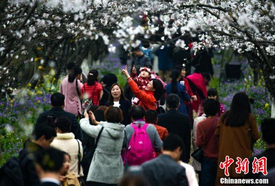 连日来,江西南昌凤凰沟樱花盛放,形成延绵万米的樱花隧道,场面极为壮观,游人络绎不绝。