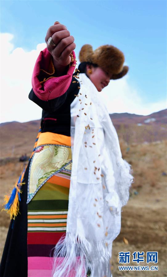 3月17日,拉萨市邦堆乡克日村村民在播撒开犁第一捧青稞种子。当日是藏历正月三十,西藏拉萨市邦堆乡的村民们身着盛装,犁开沉睡一冬的泥土,举行传承千年的春耕仪式。西藏各主要农耕区农民在这一天举行传统盛大的春耕开犁仪式,祈求风调雨顺、五谷丰登。新华社记者晋美多吉 摄