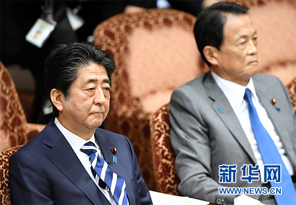 3月19日,在日本东京,日本首相安倍晋三(左)和副首相兼财务大臣麻生太郎接受议员质询。新华社记者 马平 摄