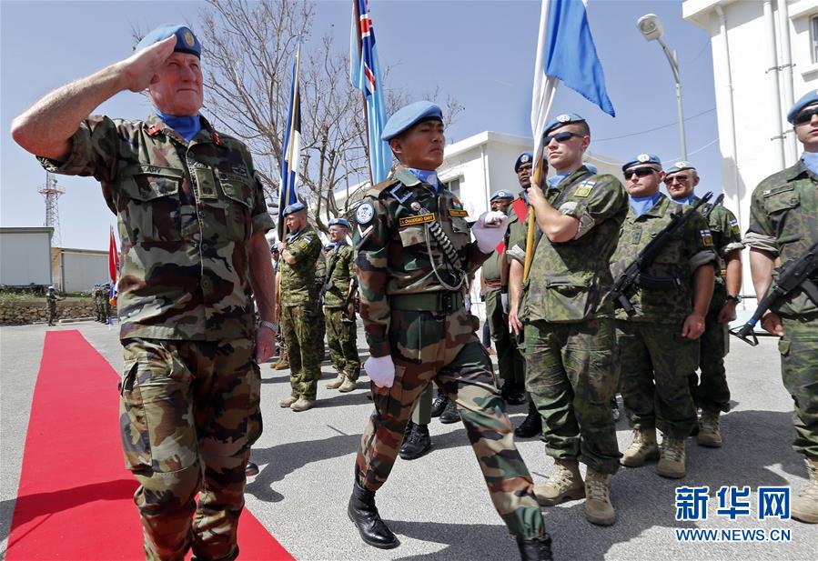 3月19日,在黎巴嫩南部纳古拉镇,联合国驻黎巴嫩临时部队司令迈克尔·比尔里(左一)在活动中检阅部队。联合国驻黎巴嫩临时部队(联黎部队)19日举行活动,纪念这支维和部队成立40周年。 新华社发(比拉尔·贾维希摄)
