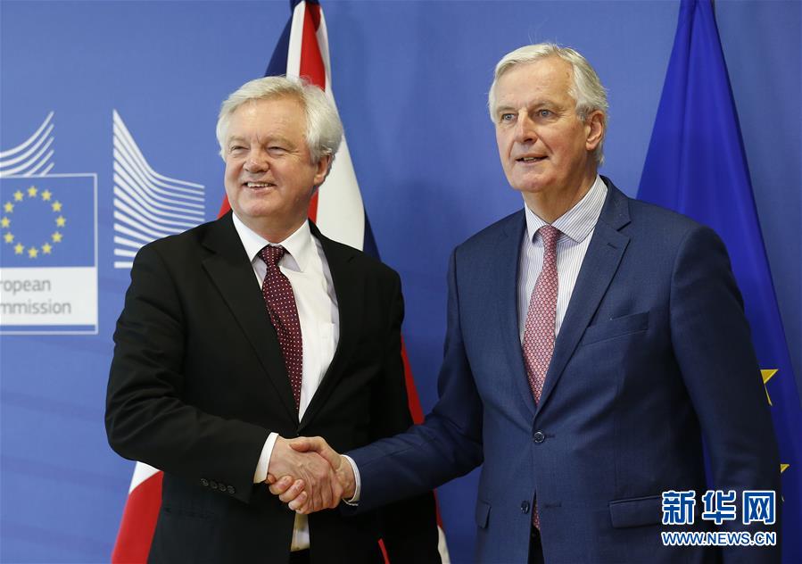 3月19日,在比利时布鲁塞尔欧盟总部,英国“脱欧”事务大臣戴维斯(左)与欧盟首席“脱欧”谈判代表巴尼耶会谈前握手。欧盟与英国19日公布了一份有关英国“脱欧”过渡期安排的协议草案,宣布已就其中大部分条款达成一致,有望在欧盟春季峰会上获得通过。新华社记者叶平凡 摄