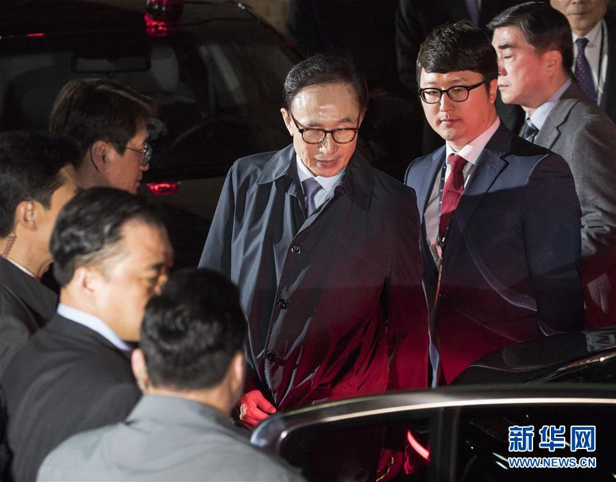 3月22日,在韩国首尔,韩国前总统李明博(中)走出私宅。韩国首尔中央地方法院22日晚对前总统李明博签发逮捕令。李明博将成为韩国第4位因涉嫌贪腐而被捕的前总统。新华社发(李相浩摄)