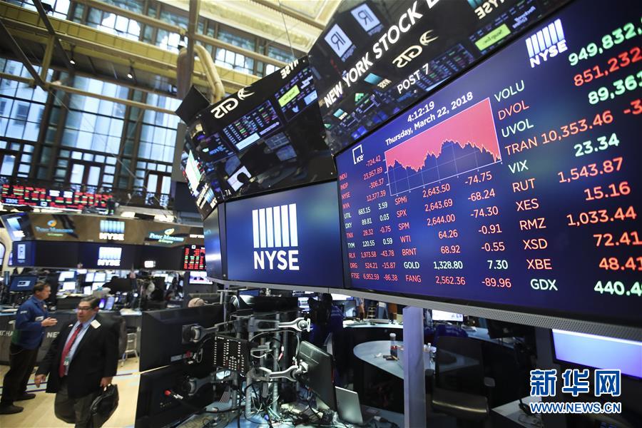 3月22日,美国纽约证券交易所大屏显示当天收盘信息。纽约股市三大股指22日收盘下跌,其中,道琼斯工业平均指数收盘暴跌逾700点。新华社记者 王迎 摄
