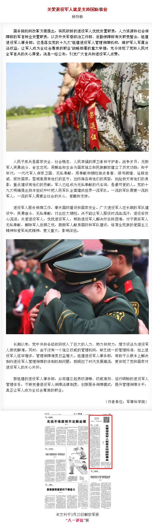 关注 | 军报言论:关爱退役军人就是支持国防事业