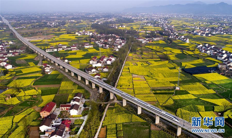 3月21日,一列动车正通过陕西省汉中市南郑县新集镇油菜花海(无人机拍摄)。新华社记者 陶明 摄