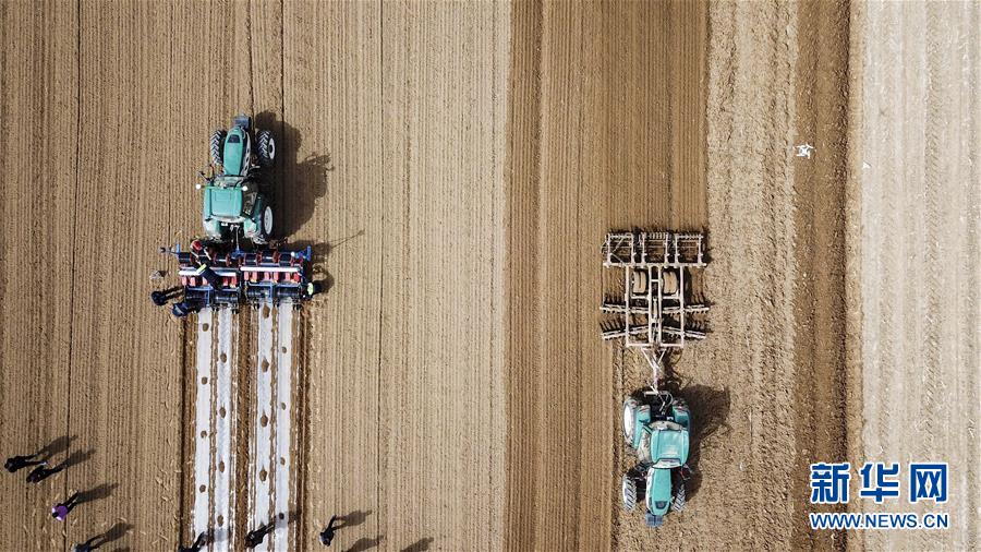 3月23日,“智能拖拉机”在新疆库车县牙哈镇的一处棉田中进行精细化作业(无人机拍摄)。新华社记者 胡虎虎 摄