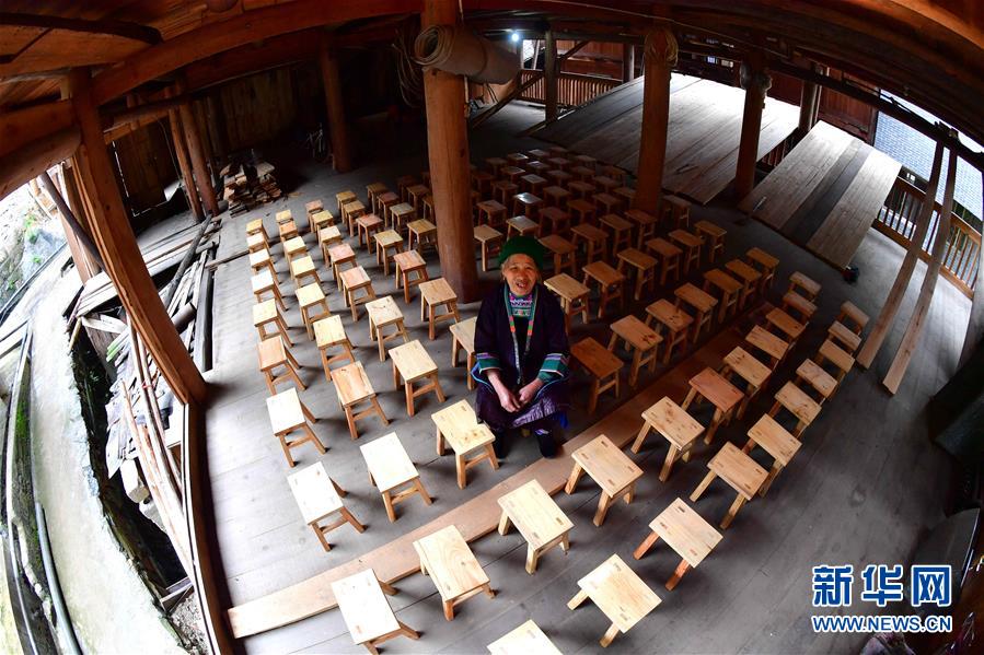 在广西融水苗族自治县杆洞乡花孖村,吴耀妈老人在展示她家的两百多个小板凳(3月14日摄)。