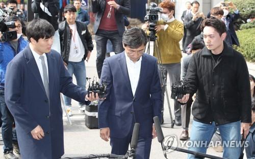 3月28日下午,在首尔西部地方法院,安熙正低头走向法院,准备接受有关性侵案的逮捕必要性审查。(图片来源:韩联社)