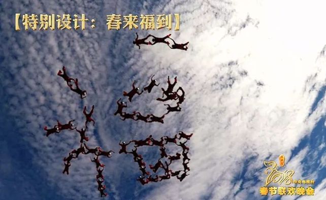 2018年央视春节联欢晚会的特别设计环节《春来福到》及“奔跑吧,新时代”2018体育嘉年华引发不少关注。48名造型跳伞运动员从5000米左右的高空跃下,在空中组成巨大的“福”字和“CHINA”字样,寓意“福从天降”。这份别致又吉祥的祝福,令电视机前的观众惊喜又好奇:这个高难度的造型是怎么来的?