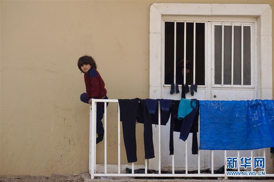 4月1日,在叙利亚大马士革以南的哈尔贾莱避难所,一名男孩爬上阳台栏杆。 新华社发(徐德智摄)