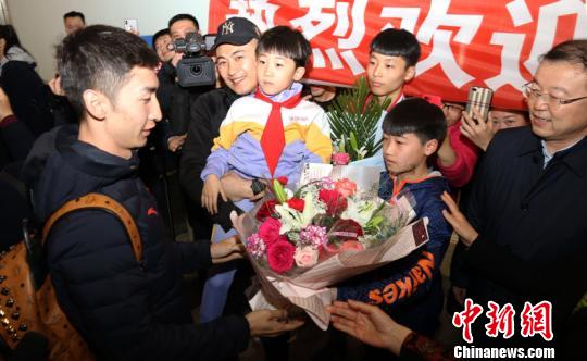 中新网佳木斯4月2日电(潘蕾 宋洋 王妮娜)随着飞机降落佳木斯机场,4月2日8时多,2018年平昌冬季奥运会男子短道500米冠军武大靖回到家乡,在机场受到热烈欢迎。