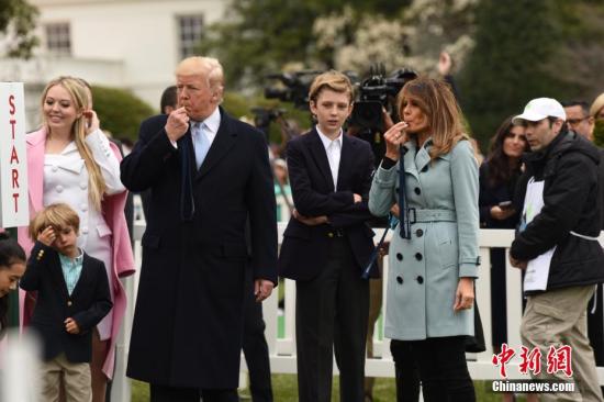 特朗普夫妇和他们12岁的儿子巴伦参加了白宫的滚彩蛋活动。