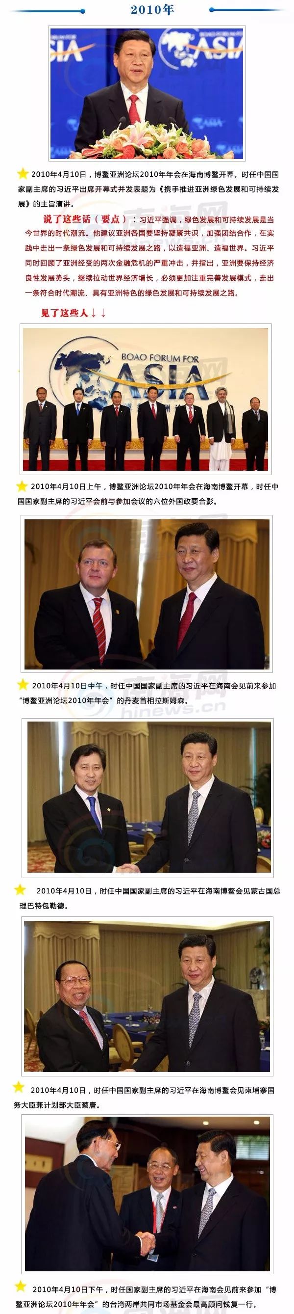 2010年4月10日,博鳌亚洲论坛2010年年会在海南博鳌开幕。时任中国国家副主席习近平出席开幕式并发表题为《携手推进亚洲绿色发展和可持续发展》的主旨演讲。