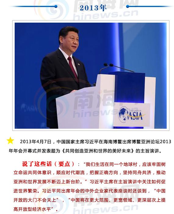这一年年会的主题是“革新、责任、合作:亚洲寻求共同发展”。在2013年4月7日上午举行的年会开幕式上,习近平主席发表题为《共同创造亚洲和世界的美好未来》的主旨演讲,阐述中国主张。在演讲中表示,习近平表示,我们生活在同一个地球村,应该牢固树立命运共同体意识,顺应时代潮流,把握正确方向,坚持同舟共济,推动亚洲和世界发展不断迈上新台阶。中国将加快同周边国家的互联互通建设,积极探讨搭建地区性融资平台,促进区域内经济融合,提高地区竞争力。
