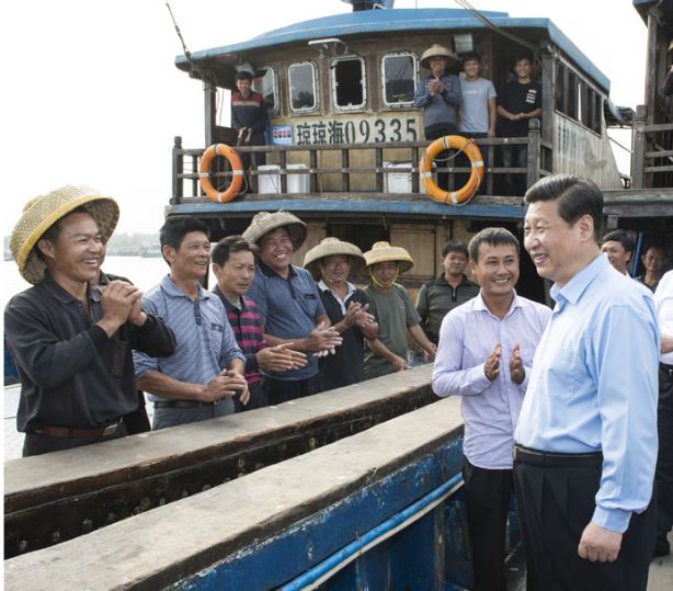 2013年4月8日下午,习近平在琼海市潭门渔港一艘渔船上向渔民了解出海捕鱼的劳动和生活。