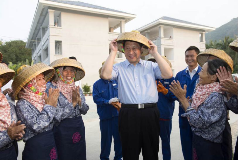 2013年4月9日下午,习近平在亚龙湾兰德玫瑰风情产业园高兴地戴上黎族群众递上的斗笠。