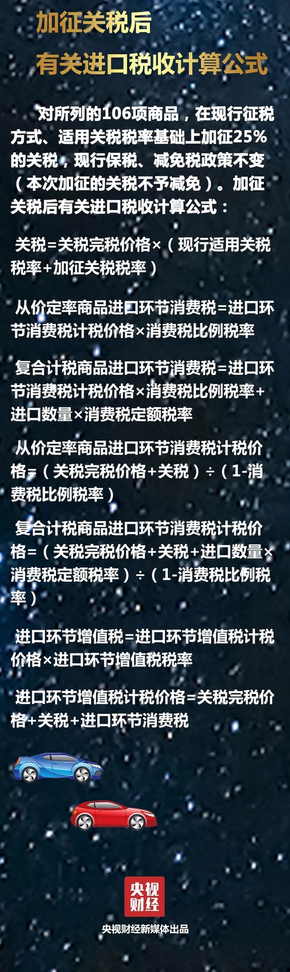 根据《中华人民共和国对外贸易法》和《中华人民共和国进出口关税条例》相关规定,经国务院批准,国务院关税税则委员会决定对原产于美国的大豆、汽车、化工品等14类106项商品加征25%的关税。实施日期将视美国政府对我商品加征关税实施情况,由国务院关税税则委员会另行公布。