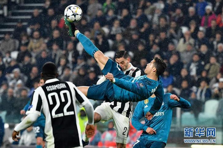 4月3日,皇马队球员克里斯蒂亚诺·罗纳尔多(中)在比赛中倒钩射门得分。当日,在2017-2018赛季欧洲足球冠军联赛四分之一决赛首回合比赛中,西甲皇家马德里队客场以3比0战胜意甲尤文图斯队。 新华社/法新