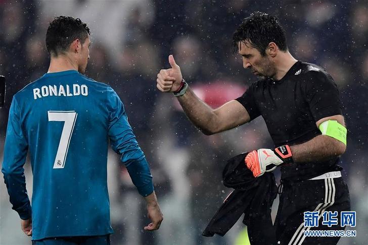 4月3日,尤文图斯队守门员布冯(右)在赛后祝贺皇马队球员克里斯蒂亚诺·罗纳尔多。 新华社/法新