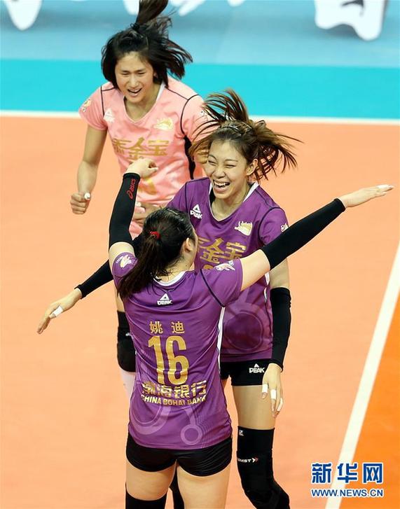 4月3日,天津渤海银行队队员庆祝夺冠。当日,在2017-2018赛季中国女子排球超级联赛决赛第七场比赛中,天津渤海银行队客场以3比2战胜上海光明优倍队,以4比3的总比分夺得冠军。新华社记者凡军摄