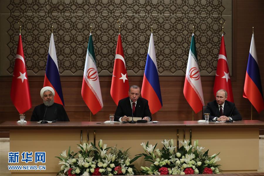 4月4日,在土耳其安卡拉,土耳其总统埃尔多安(中)、俄罗斯总统普京(右)和伊朗总统鲁哈尼出席叙利亚问题峰会后的联合记者会。新华社发(穆斯塔法·卡亚摄)