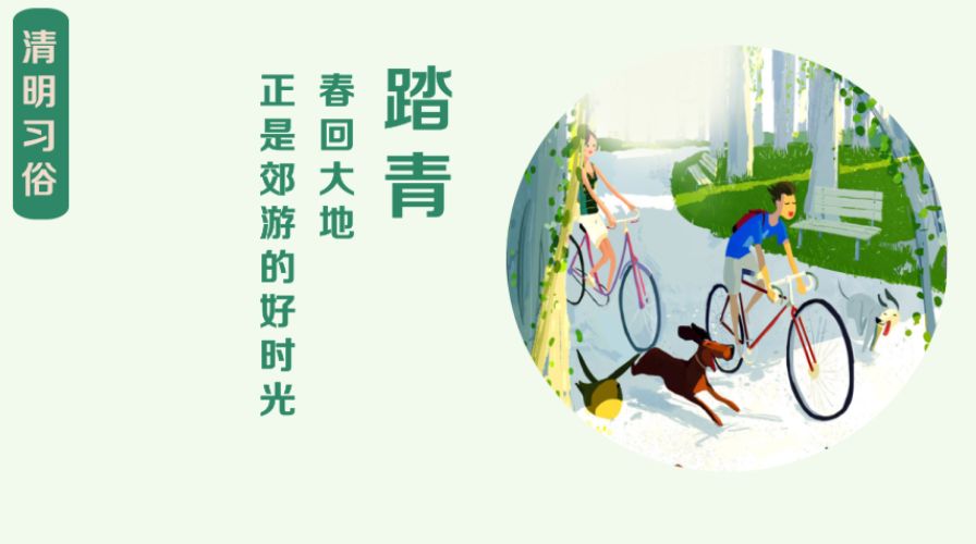 又叫春游。古时叫探春、寻春等。四月清明,春回大地,自然界到处呈现一派生机勃勃的景象,正是郊游的大好时光。中国民间长期保持着清明踏青的习惯。