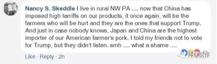 (编者注:我住在宾州西北部农村…中国准备对我们的产品加征关税,曾支持特朗普的农民会再次受伤……我告诉过我的朋友不要给特朗普投票,但他们不听。哎,太无语了……)