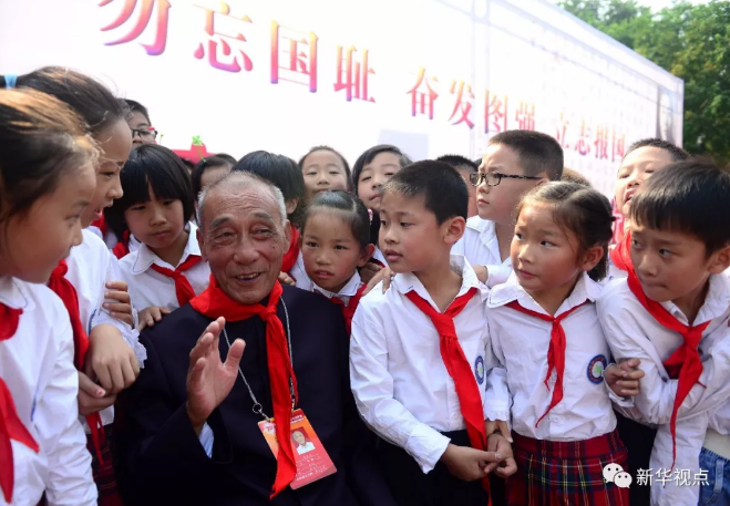 2015年9月18日,抗战烈士蔡炳炎之子蔡浙生为安徽省合肥市朝霞小学学生讲述抗战故事。新华社记者 刘军喜 摄