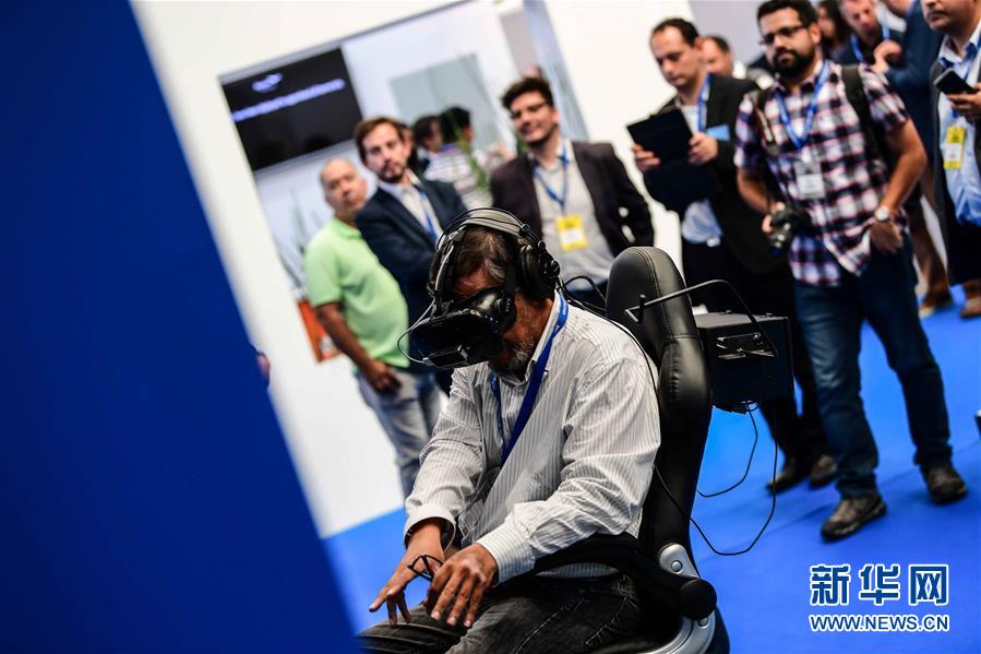4月3日,在智利首都圣地亚哥国际机场,一名参观者体验模拟飞行。