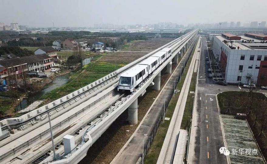 上海,2018年3月23日,地铁列车行驶在上海首条无人驾驶APM线路——浦江线上(无人机航拍)。新华社记者丁汀摄