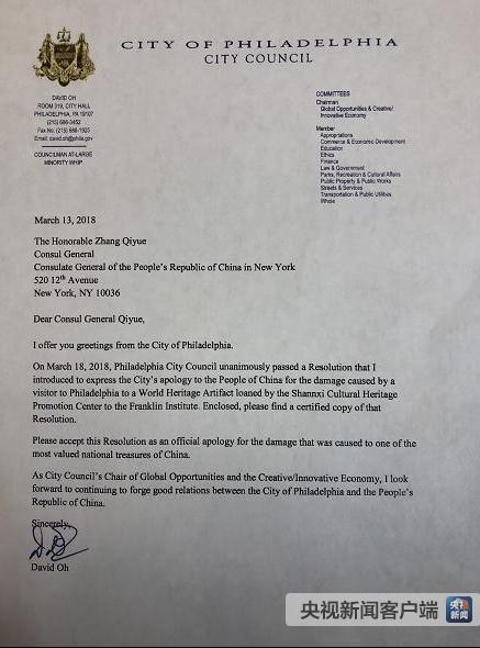 目前,该作案男子被逮捕后保释,正在等待法庭的审判,面临最高可达有期徒刑30年的判决。而另一方面,费城市政府在日前通过了一份决议,正式向中方进行书面道歉。