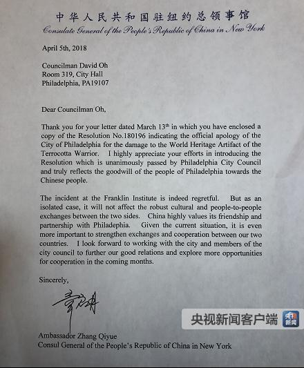 美国费城就中国兵马俑展品被损坏事件书面道歉