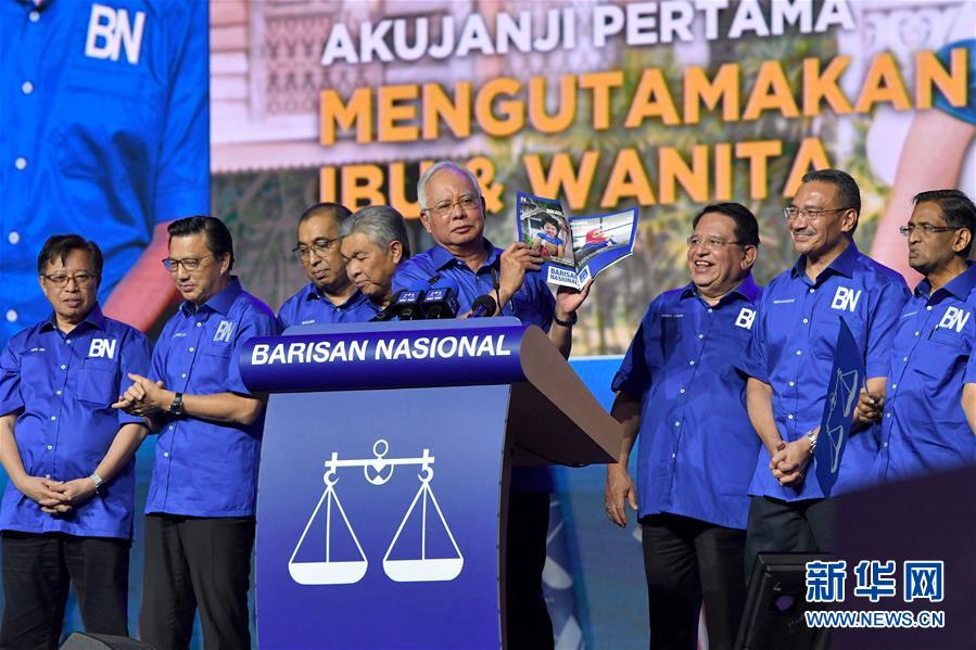 4月7日,在马来西亚吉隆坡,马来西亚总理纳吉布(右四)出席执政联盟国民阵线(国阵)竞选宣言发布仪式。