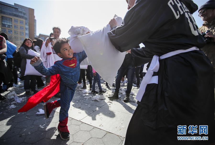 4月7日,在美国纽约,人们参加“枕头大战”。当日,美国多地举行“枕头大战”,人们在活动中释放压力,愉悦身心。 新华社记者 王迎摄